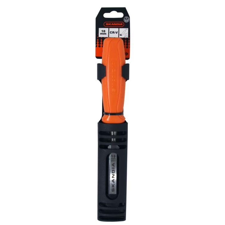 Skandia steekbeitel. Met groot kunststof heft, ook wel hecht of handvat genoemd en een snijbreedte van 18 mm. Een steekbeitel voor houtbewerking wordt gebruikt om hout af te steken, bijvoorbeeld bij het maken van een halfhoutverbinding en is meestal voorzien van een houten of kunststof handvat/heft/hecht. De steekbeitel heeft een aan één kant schuin geslepen scherpe snede, ook wel vouw genoemd. De snijhoek voor de steekbeitel bedraagt 25 tot 30 graden. Uitvoering: Groot kunststof handvat, met beschermhouder. Het grote kunststof handvat zorgt voor een verbeterde grip en een maximale controle. De steekbeitel is gesmeed uit chroom vanadium staal, goed gehard en scherp geslepen.