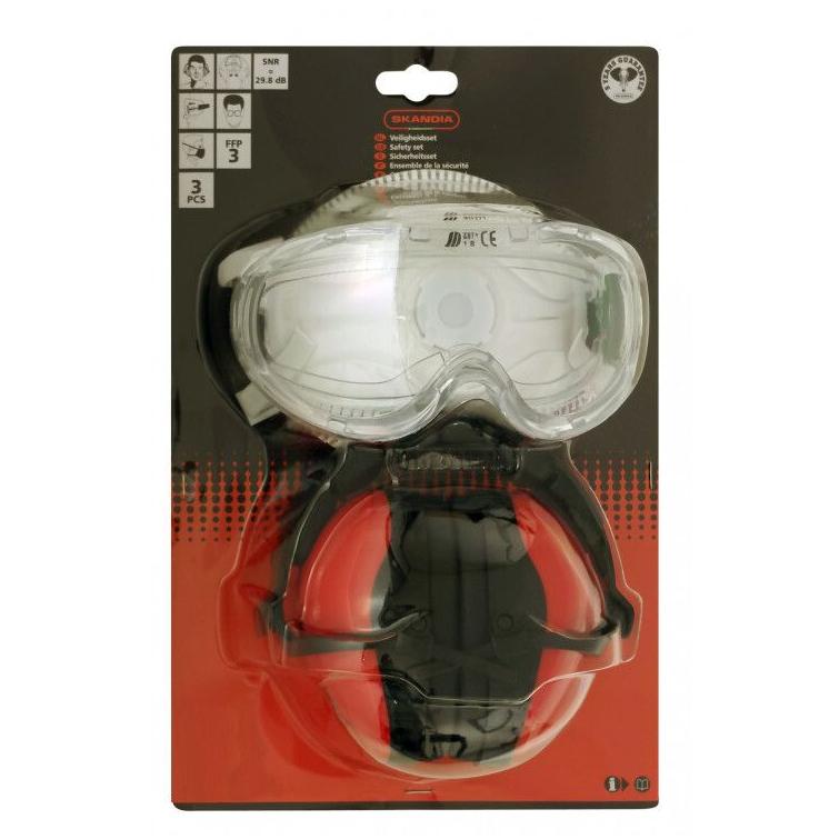 Deze professionele Comfort veiligheidsset van Skandia bestaat uit een veiligheidsbril, gehoorbeschermer en stofmasker.