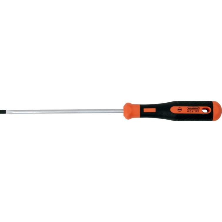 Schroevendraaier, sleufmodel. Smalle electro-uitvoering. Heft met ophanggat, gemaakt uit twee componenten anti-slip kunststof. Ergonomisch gevormd voor optimale grip en krachtoverbrenging. Kling is van chroom vanadium staal en met extra nageharde zwarte punt, volgens DIN 5264. Zorg altijd dat de punt van de schroevendraaier de juiste maat/pasvorm heeft ten opzichte van de schroef. Klinglengte 125 mm, blad/puntbreedte 4 mm, totale lengte 225 mm.