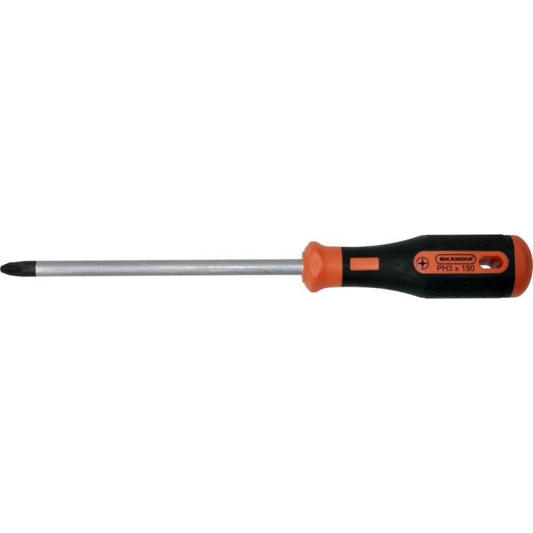 Kruiskopschroevendraaier, ook wel sterschroevendraaier genoemd. Phillips (PH) kruiskop maat PH 3. Heft met ophanggat, gemaakt uit twee componenten anti-slip kunststof. Ergonomisch gevormd voor optimale grip en krachtoverbrenging. Kling is van chroom vanadium staal en met extra nageharde zwarte punt, volgens DIN 5264. Zorg altijd dat de punt van de schroevendraaier de juiste maat/pasvorm heeft ten opzichte van de schroef. Klinglengte 150 mm, totale lengte 260 mm.