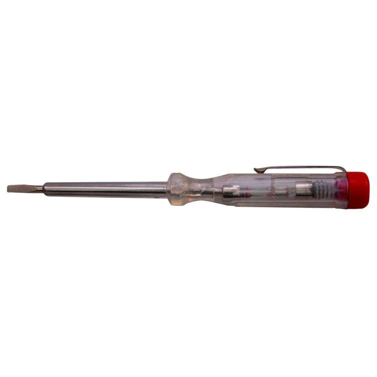 Spanningzoeker ook wel spanning/tester/schroevendraaier genoemd. Dit is een éénpolige spanningzoeker, een eenvoudig en goedkoop hulpmiddel om de aanwezigheid van wisselspanning vast te stellen. Niet stroom-geleidend van 125 t/m 250 volt. Geïsoleerde kling. Doorzichtig kunststof heft met daarin een controlelampje. Schroevendraaier klein model met metalen vestzakclip. Heel praktisch en veilig om te testen of er spanning staat op electriciteitsdraden of stopcontacten. Ook eenvoudig om een plus of min te vinden. Klinglengte 60 mm, blad/puntmaat 3 mm, totale lengte 140 mm.