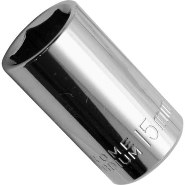 Dop, ook wel dopsleutel genoemd, maat 15 mm. Een dopsleutel wordt gebruikt om een moer of bout, al naar gelang de maat, in of uit te draaien. Aan de ene kant heeft de dop een binnenzeskant voor een moer of bout en aan de andere kant een aansluiting van een vierkant gat ½" (12,7 mm), voor diverse hulpstukken, zoals ratels, verlengstukken, kniegewricht enz. Vervaardigd uit chroom vanadium staal, hoogglans verchroomd.