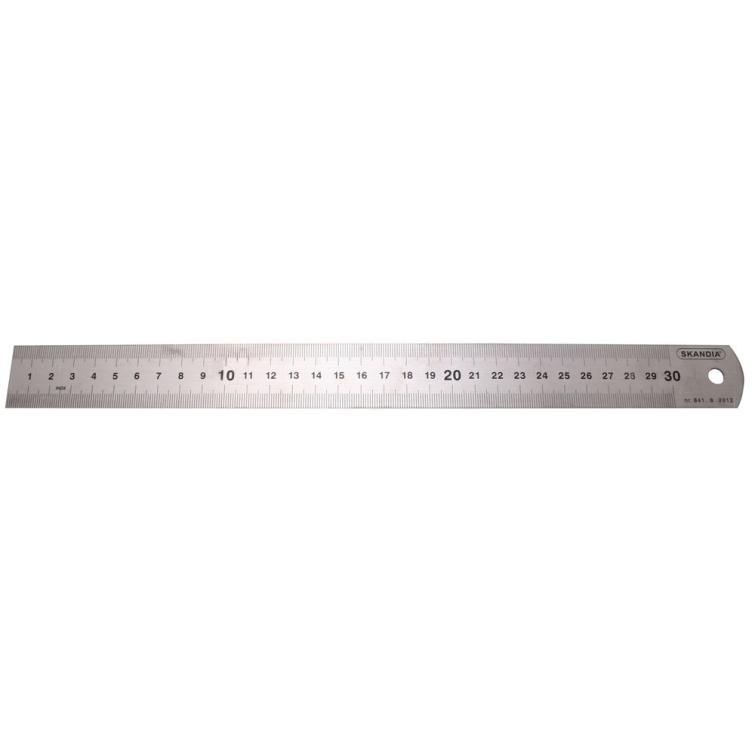 Skandia voetstok, ook wel maatlat of liniaal genoemd. Met uitgebreide conversietabel voor o.m. inch/mm omrekening, boormaten voor tappen etc. Op de voetstok wordt de verdeling weergegeven in doorgaande mm. Om nauwkeurig te meten maakt men gebruik van een voetstok, waarbij een potlood gebruikt wordt bij het opmeten van hout, een kraspen bij metaal en een viltstift bij kunststof. Vervaardigd uit gehard roestvaststaal, gepolijst. Totale lengte 300 mm, breedte 28 mm, dikte1 mm.
