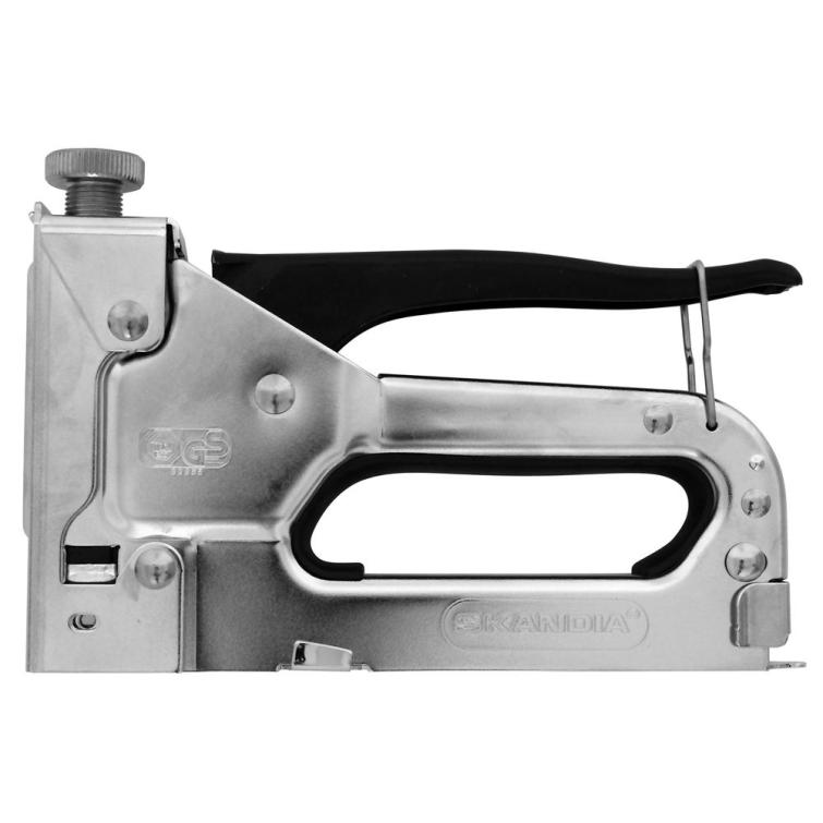 Nietmachine, ook wel handtacker genoemd. Een zwaardere metalen uitvoering met een metalen binnenwerk. Slagkracht instelbaar door een draaiknop. Een nietmachine wordt o.a. gebruikt voor het vastnieten van stoffering op een stoelframe, fotodoek op een raamwerk en diverse isolatie-materialen enz. Geschikt voor nieten van het type 53, 053, 530 met de maten: 4 mm tot 14 mm.