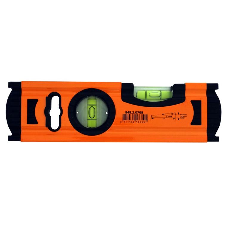 Skandia compacte waterpas, totale lengte 200 mm. Een waterpas dient om te bepalen of een vlak of lijn exact horizontaal of verticaal is. Het waterpas wordt bijv. veelvuldig gebruikt in de bouw voor het plaatsen en stellen van kozijnen en deuren en in de installatietechniek voor het opstellen van toestellen en aanleggen van leidingen. Geprofileerd kokermodel van 60 x 22 mm met een materiaaldikte van 1,5 mm. Uitvoering: aluminium voorzien van oranje epoxy deklaag. Onder- en bovenzijde gefreesd. 2 bloklibellen t.w. 1 horizontaal, 1 verticaal. Met zwarte kunststof eindstoppen. Nauwkeurigheid: 0,029º. Dit betekent 0,5 mm per meter.