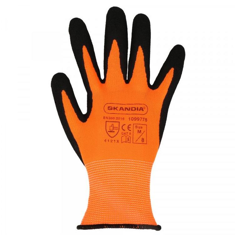 Skandia werkhandschoen voorzien van een korrelige Nitrile-coating op de handpalm en vingertoppen, voor extra grip in een vette werkomgeving. Met een ventilerende rug voor extra verkoeling. De gebreide manchet zorgt voor een goede pasvorm. Heeft een uitstekende slijtbestendigheid en een goede scheurweerstand. Verkrijgbaar in de maten 8 (M), 9 (L) en 10 (XL). Uitstekende bescherming tijdens het klussen tegen vuil en verwondingen.