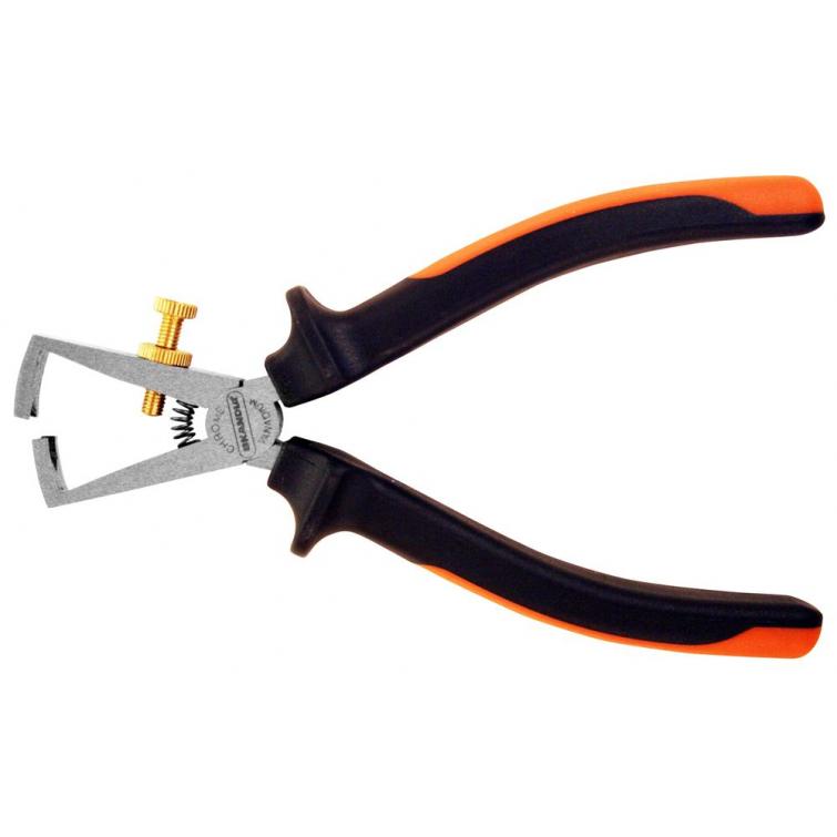De Skandia striptang is speciaal bedoeld voor het strippen (isolatiemateriaal verwijderen) van elektrische bedrading. De striptang is in diameter aan te passen door middel van een stelschroef die ingesteld wordt op de diameter van de kern, het koper, van het snoer of draad. Door de aanwezige veer in de tang veren de handgrepen vanzelf open. Vervaardigd uit hoogwaardig chroom-vanadium staal, blank gepolijst. Zwart/oranje, 2-componenten kunststof handgrepen met anti-slip en beschermnokken.