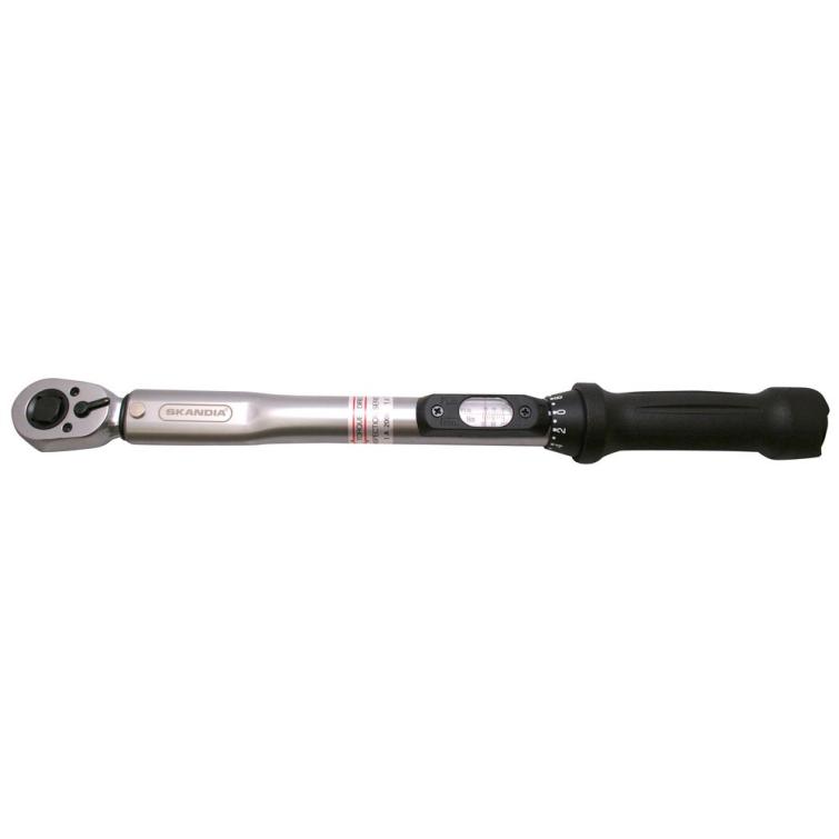 Een Skandia momentsleutel is een speciale instelbare sleutel om bouten of moeren mee aan te kunnen draaien op een vooraf ingesteld (door de fabriek voorgeschreven) aandraaimoment. Dat is de kracht waarmee je een moer of bout aandraait. Zeer belangrijk bij bijvoorbeeld het monteren van lichtmetalen velgen, cilinderkoppen e.d. De ratelkop is omschakelbaar en daarnaast aan twee kanten te gebruiken d.m.v. het doorsteekvierkant.Als de ingestelde kracht bereikt is slaat de sleutel automatische af met hoor- en voelbaar signaal. Duidelijke analoge nulpunt aanduiding, precies instelbaar via het handvat. Wordt geleverd in een kunststof cassette en met een Nederlandse gebruiksaanwijzing. Materiaal: Chroom vanadium, mat verchroomde uitvoering. Aansluiting: ½" (12,7 mm).De sleutel is instelbaar met een draaimoment van 30 - 210 Nm en een totale lengte van 490 mm.