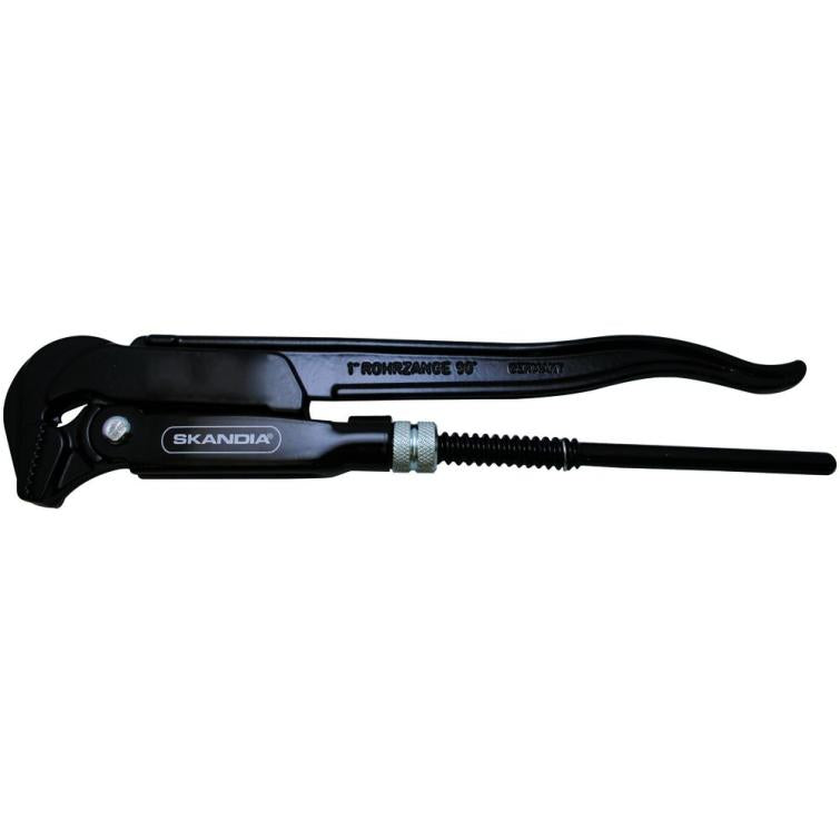Skandia pijptang, Zweeds model. Wordt onder andere gebruikt bij het aanleggen of repareren van centrale verwarming. Tevens geschikt voor het vast en los draaien van flenzen en grote moeren waar geen sleutel op past. De bekken van de pijpentang pakt de pijp of buis op drie punten vast waardoor een zeer goede grip verkregen wordt, staat onder een hoek van 90° en is door middel van een stelschroef traploos instelbaar. Door de extra lange lengte is er grote kracht mee uit te oefenen. Totale lengte 320 mm, spandiepte 35 mm, spanbereik 45 mm.