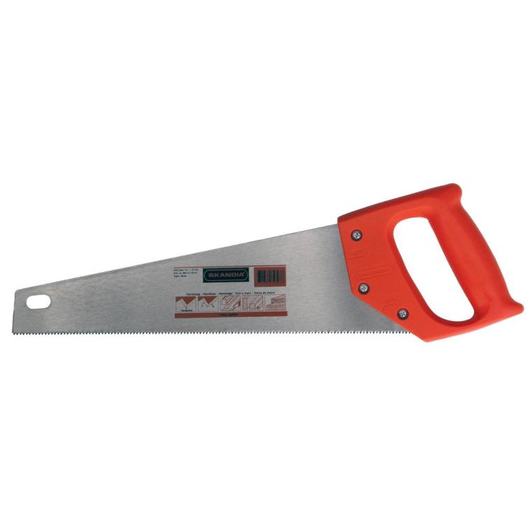Skandia universele handzaag 300 mm, "handy" model, met hardpoint vertanding. Dankzij de hardpoint vertanding blijft de zaag langer scherp. Geschikt voor diverse zaagwerkzaamheden zoals het afkorten van onder andere plinten, profielen en laminaatdelen, het doorzagen van kunststof afvoerleidingen en het op maat zagen van hardhouten glaslatten. In het zaagblad zit een gat om de zaag op te hangen en de zaag is voorzien van een kunststof tandbeschermer. Tweezijdig geslepen zaagblad. Zaagbladlengte 300 mm, 9 tanden per inch (9 TPI).
