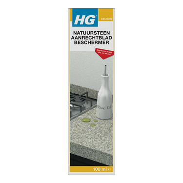 HG topprotector voor marmer/graniet vormt een absoluut kleurloze en onzichtbare bescherming voor marmer, kalksteen, zandsteen, graniet en dergelijke. De natuursteen aanrechtbladbeschermer (product 36) beschermt met name tegen (spijs)oliën, plantaardige en dierlijke vetten en nog vele andere soorten vervuiling. Zonder deze bescherming kan de vervuiling tot diep in de poriën van het materiaal dringen en vervolgens moeilijk tot zelfs onmogelijk te verwijderen vlekken veroorzaken. Het product is te gebruiken op keukenvloeren, tafelbladen, aanrechtbladen, schouwen, stenen tuinmeubilair en tuinbeelden en dergelijke. 100 ml is voldoende voor 10 m². Voor de beste bescherming tegen vocht in de badkamer en in de keuken, adviseren wij een voorbehandeling met HG natuursteen beschermer (product 35).