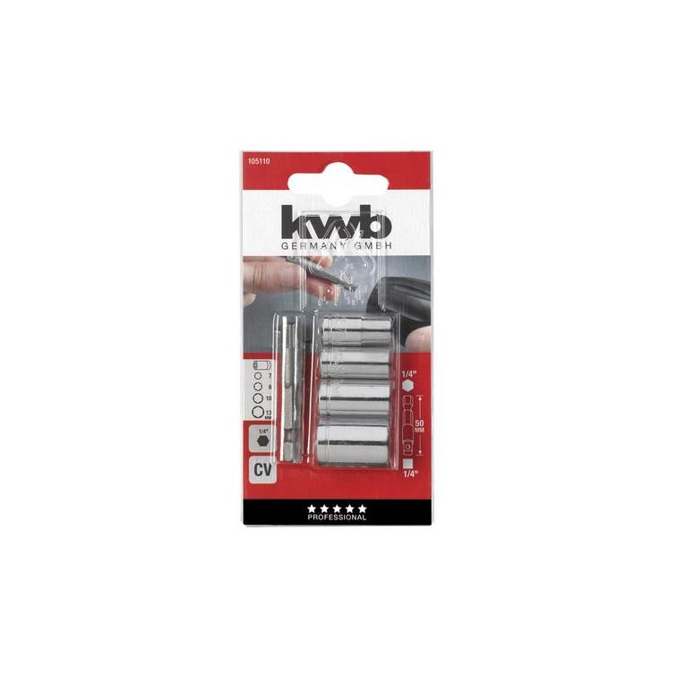 Doppenset 7, 8, 10 en 13 mm met adapter 50 mm in chroom-vanadium, hoogglanzend verchroomd, houder 1/4”, aandrijving 1/4”-zeskant volgens ISO 1173, E 6.3.