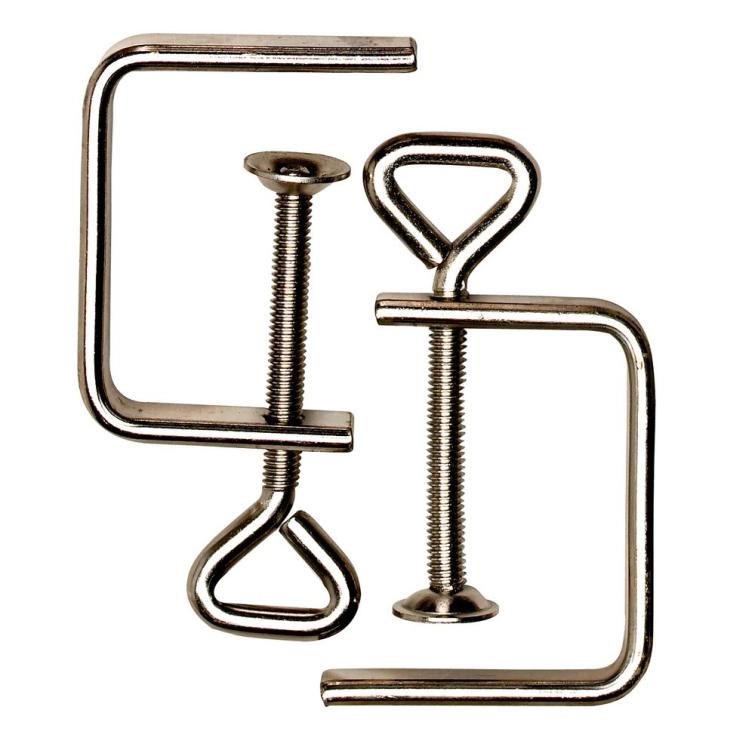 Skandia figuurzaagklem. Deze klem wordt niet niet uitsluitend als figuurzaagklem gebruikt, maar ook voor andere doeleinden, zoals bijvoorbeeld een mini lijmtangetje. Staal verzinkt en een klembereik van 50 mm. Set van 2 stuks op kaart.