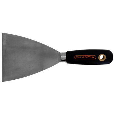 Skandia afsteekmes met een breedte van 100 mm. Wordt onder andere gebruikt voor het afsteken van roest, stucwerk, oude verf, behang, gelijmde vloerbedekking of duivenpoep. Extra stevig (niet verend) blad. Zwart gelakt houten handvat, met ophanggat.