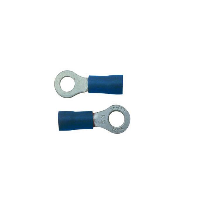 Skandia kabelschoen, kleur blauw, geschikt voor elektriciteitsdraad van 1,5 t/m 2,5 mm², oogmodel, passend op een boutje of schroefje M5, inhoud 10 stuks. Kabelschoenen worden onder andere veel gebruikt in huishoudelijke elektrische apparaten, auto's, motoren en boten om elektrische verbindingen te maken. Veel kabelschoenen worden speciaal toegepast bij deze verbindingen omdat ze weer eenvoudig zijn los te koppelen. Een kabelschoen wordt bevestigd met een kabelschoentang (krimptang). Met deze kabelschoentang wordt de huls van de kabelschoen, waarin de elektrische draad wordt gestoken, plat geperst (krimpen), waardoor een verbinding ontstaat tussen de draad met het kabelschoen.