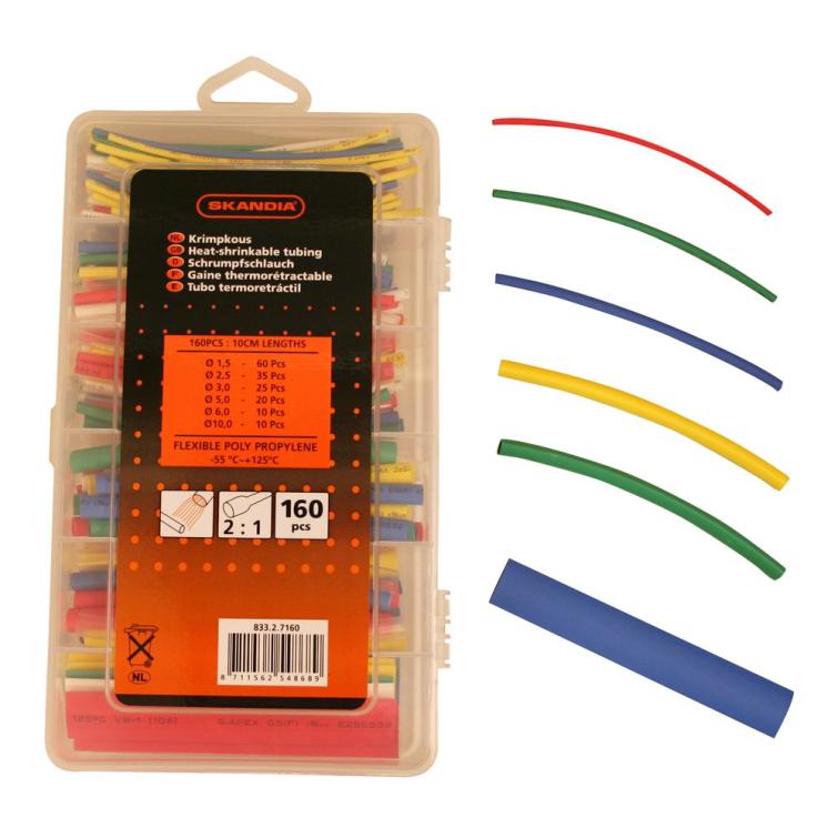 De 160-delige Skandia krimpkousset is hét hulpmiddel bij het maken van allerlei draadverbindingen. Krimpkousen, gemaakt van polypropyleen (een soort kunststof), krimpen door verhitting waardoor ze als elektrisch isolatiemateriaal kunnen worden toegepast. Ideaal te gebruiken bij draadverbindingen van delen met ongelijke diameter of vorm. De Skandia krimpkous kent een relatief laag smeltpunt. Daardoor kunnen de kousen op een simpele manier verhit worden: een föhn geeft al voldoende warmte. Na verhitting krimpt een krimpkous enkel in diameter en niet in lengte.