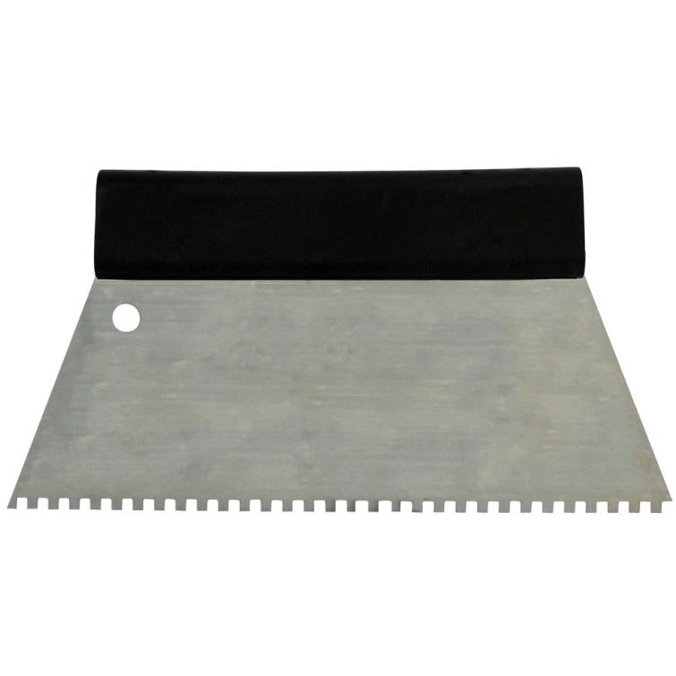 Skandia lijmkam, ook wel kitstrijker genoemd. Maat 4 x 4 mm, met haakse tanden. Extra lange uitvoering van 250 mm en hoog 85 mm. Een lijmkam is een spatel met zaagvormige of trapeziumvormige tanden, waarmee lijm of kit gelijkmatig aangebracht kan worden op een ondergrond, zoals bijv. muren en vloeren. De grofte van de lijmkam en de hoeveelheid lijm (kit) hangen meestal samen met het te lijmen materiaal. Voor kurk, textiel, linoleum en vloerbedekking wordt 1,5 mm t/m 2 mm schuine vertanding gehanteerd. Voor het lijmen van tegels of het in de kit zetten met een lijmkam voorzien van een haakse vertanding gelden in het algemeen de volgende maten, t.w. tegelgrootte 0-15 cm een tanddiepte lijmkam van 6 mm, tegelgrootte 16-25 cm een tanddiepte van 8 mm, tegelgrootte 30 cm of meer een tanddiepte van 10-12 mm. Uitvoering: Buigzaam blad. Zwart kunststof handvat (trekt niet krom na het schoonmaken). Met ophanggat.