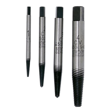 Skandia schroefeinduithaler-set, ook wel tapeinduithaler of linksetappen genoemd, 4-delig. Voor het uitdraaien van afgebroken bouten van M3 t/m M14. Doe, voor het verwijderen van een afgebroken bout of schroef eerst, indien mogelijk, ruim kruipolie op de afgebroken bout. Boor vervolgens met een kleine metaalboor een zo klein mogelijk gaatje. Boor daarna met de voorgeschreven metaalboor het juiste gat en draai dan de linkse tap in het daarvoor bestemde gat. Inhoud: nummer 1 voor bouten van 3 t/m 4 mm met boormaat 1,8 mm, nummer 2 voor bouten van 5 t/m 7 mm met boormaat 2,6 mm, nummer 3 voor bouten van 8 t/m 10 mm met boormaat 3,7 mm, nummer 4 voor bouten van 11 t/m 14 mm met boormaat 5,5 mm. Uitvoering: Chroom vanadium staal. Geheel gehard. Conische linkse spoed.