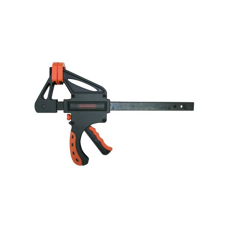 Skandia snellijmtang, ook wel eenhandsklem genoemd. De oranje/zwart kunststof 2 componenten antislip pistoolgreep zorgt voor het snel en gemakkelijk klemmen en is met één hand te bedienen. De kunststofkapjes geven een groter drukvlak. Door het speciale systeem kan de klem omgezet worden om een voorwerp uit elkaar te drukken (spreiden). Klembereik 300 mm, klemdiepte 75 mm.