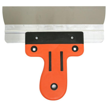 Skandia RVS spackmes, ook wel pleistermes, plafondstrijker, gevelspatel of pleisterspackmes genoemd. Breedte 250 mm. Wordt gebruikt door de stukadoor na het opzetten van de pleisterlaag. De pleisterlaag enigszins laten opstijven, daarna met het spackmes over de pleister heen om deze strakker af te maken. Herhaal deze handeling nogmaals na enig opstijven. Elastisch roestvaststaal buigzaam blad gevat in een lichtmetalen houder/profiel en uitgevoerd met een zwart-oranje kunststof 2 componenten softgrip handgreep. Voordelen van een kunststof heft t.o.v. een houten heft bij dit product is: Kunststof mag rustig nat/vochtig worden terwijl bij een houten heft de kans bestaad dat deze krom gaat trekken. Tevens heeft men door het softgrip en de dikte er van meer comfort en preciesie. Ook geschikt voor diverse andere doeleinden. Met ophanggat. Totale breedte 250 mm.