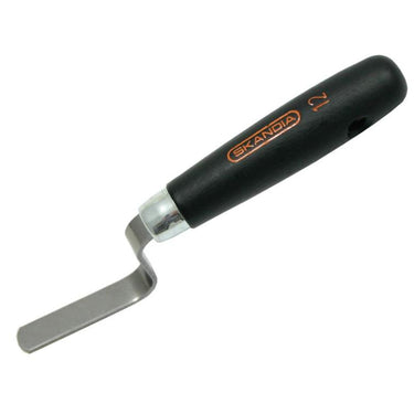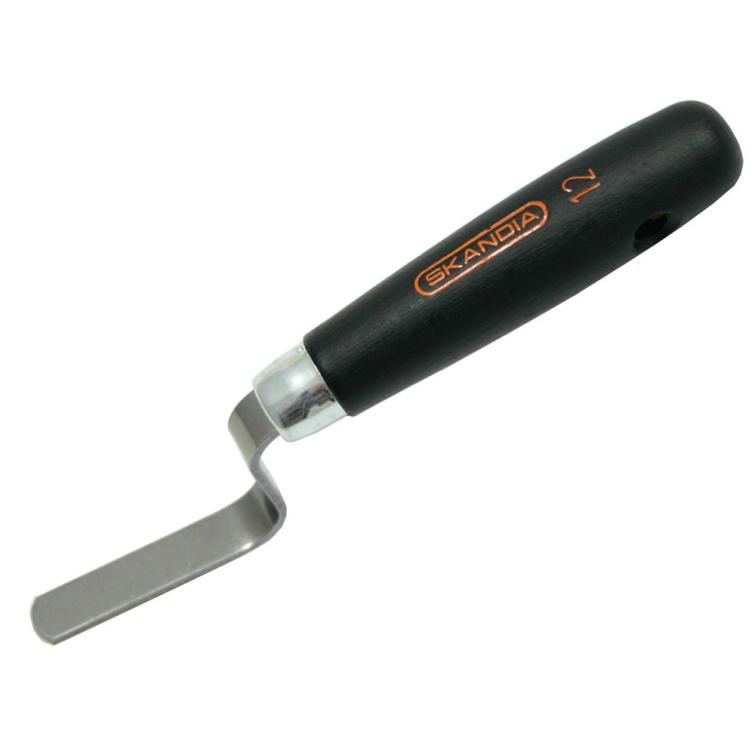 Skandia stootvoegspijker. Deze spijker is speciaal voor de verticale (stoot) voegen, wordt onder andere gebruikt door de voeger, om met voegspecie voegen in metselwerk (met name schoon metselwerk) te vullen. Het voegbord wordt met een voorraad voegspecie bij de onderkant van de stootvoeg (verticale voeg) gehouden en met behulp van de voegspijker gevuld met specie. Deze uitvoering heeft een blank gepolijst blad en is een extra kort model. Dun uitlopend geslepen, zwart gelakt houten handvat, voorzien van ophanggat. Bladlengte 50 mm, bladbreedte 8 mm.