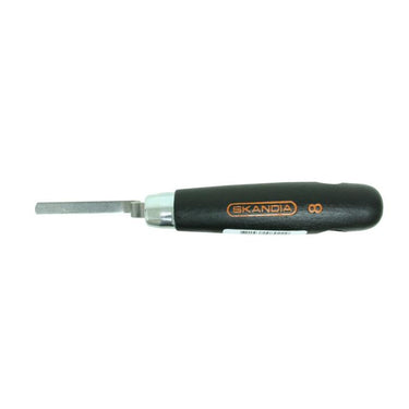 Skandia stootvoegspijker. Deze spijker is speciaal voor de verticale (stoot) voegen, wordt onder andere gebruikt door de voeger, om met voegspecie voegen in metselwerk (met name schoon metselwerk) te vullen. Het voegbord wordt met een voorraad voegspecie bij de onderkant van de stootvoeg (verticale voeg) gehouden en met behulp van de voegspijker gevuld met specie. Deze uitvoering heeft een blank gepolijst blad en is een extra kort model. Dun uitlopend geslepen, zwart gelakt houten handvat, voorzien van ophanggat. Bladlengte 50 mm, bladbreedte 8 mm.