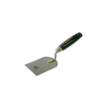 Skandia RVS stukadoorsbandtroffel wordt gebruikt om reparaties uit te voeren en sleuven aan te smeren met pleistermortel en andere vulmiddelen. Deze uitvoering heeft een roestvaststalen gepolijst blad, enigszins verend, voorzijde recht, zwart gelakt houten handvat met ophanggat.