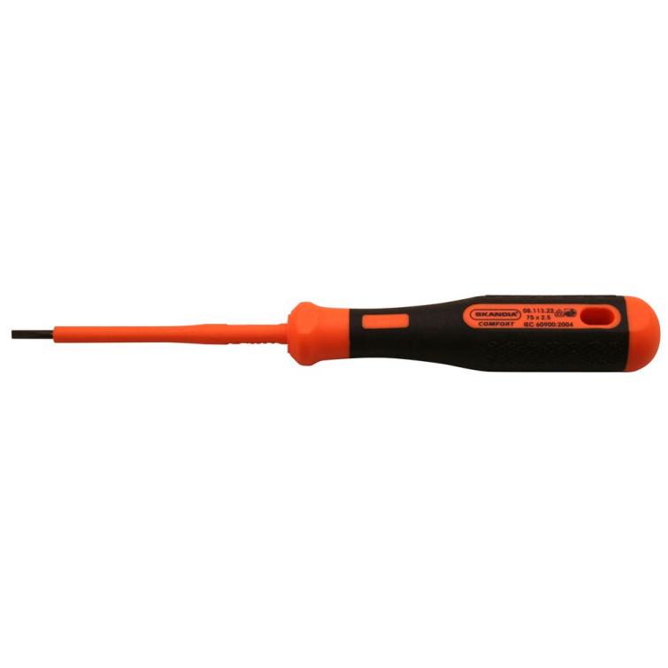 VDE-schroevendraaier, sleuf model. Geheel geïsoleerd en volgens de nieuwste GS/VDE voorschriften tot 1000 volt gecontroleerd. Heft met ophanggat, vervaardigd uit twee componenten anti-slip kunststof. Ergonomisch gevormd voor optimale grip en krachtoverbrenging. Kling is vervaardigd van chroom vanadium staal en met extra nageharde zwarte punt, volgens DIN 5264. Zorg altijd dat de punt van de schroevendraaier de juiste maat/pasvorm heeft ten opzichte van de schroef. Schakel altijd de stroom uit bij de meterkast! Klinglengte 75 mm, blad/puntbreedte 2,5 mm, totale lengte 175 mm.